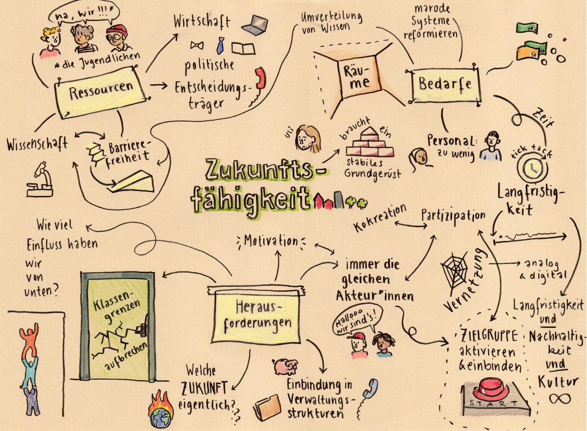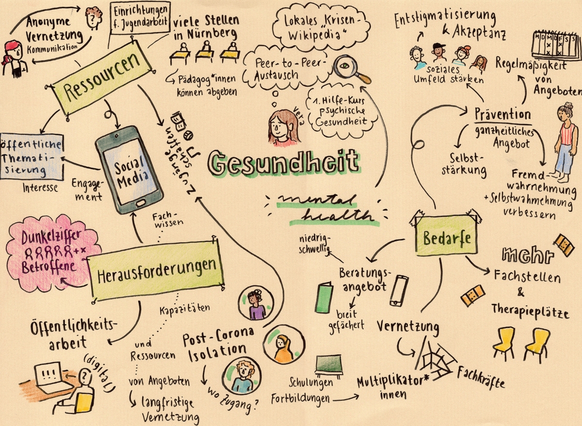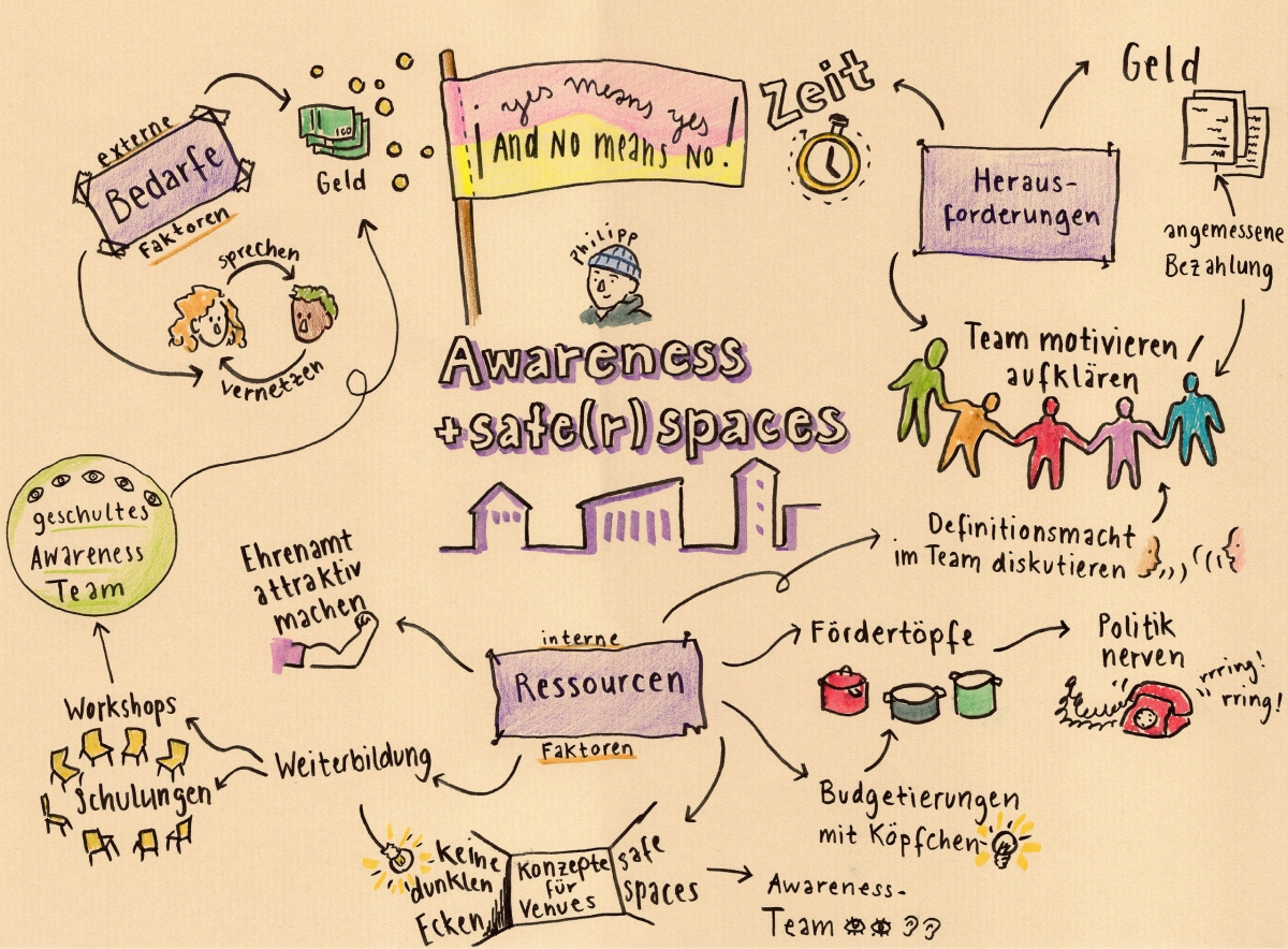 Um auch den Austausch untereinander zu fördern fanden Tischgespräche statt, die sich mit verschiedenen Themen wie Empowermetn, Awareness und Gesundheit auseinandersetzten und von Johanna Meier als Graphic Recorderin begleitetet wurden. Die Ergebnisse des Graphic Recordings sind unten zu sehen.